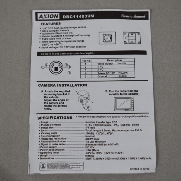 Axion DBC114039M Rückfahrkamera incl. 20 Meter Kabel und Halter